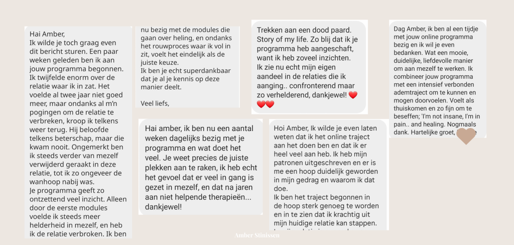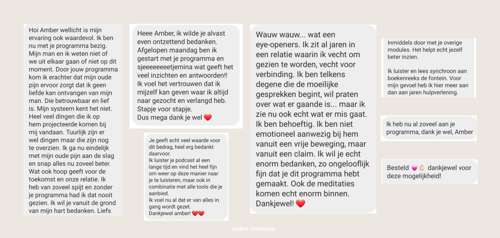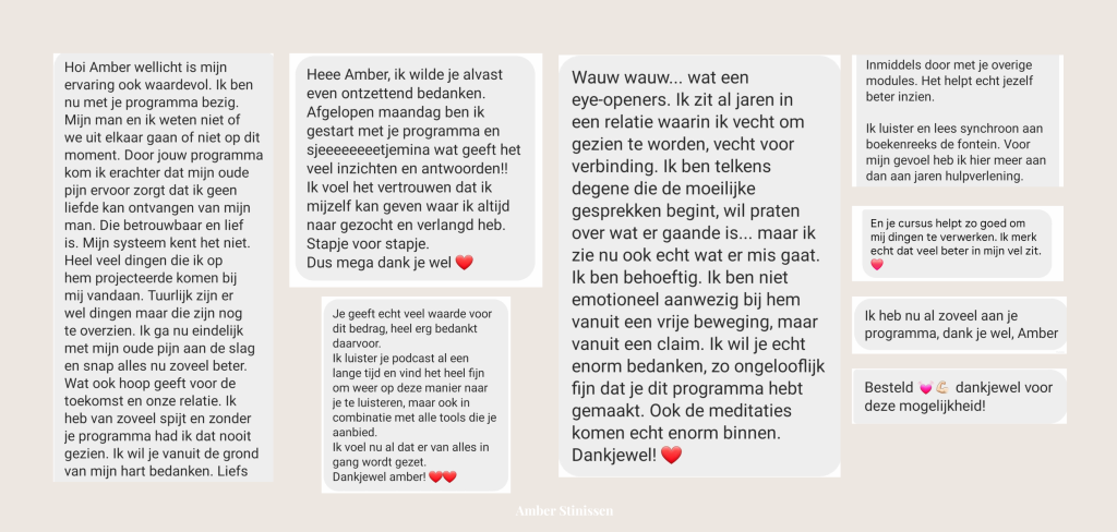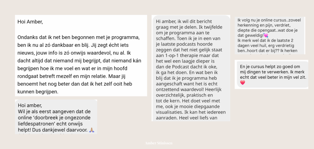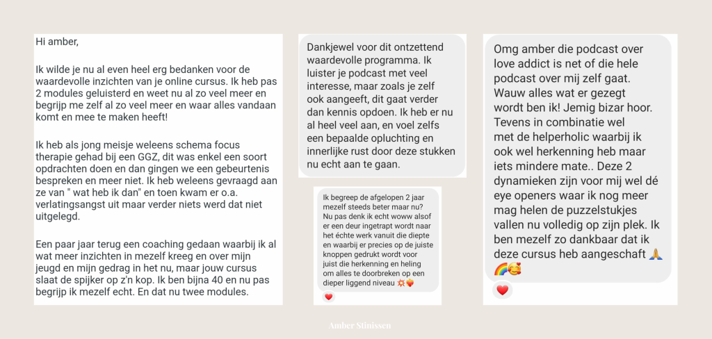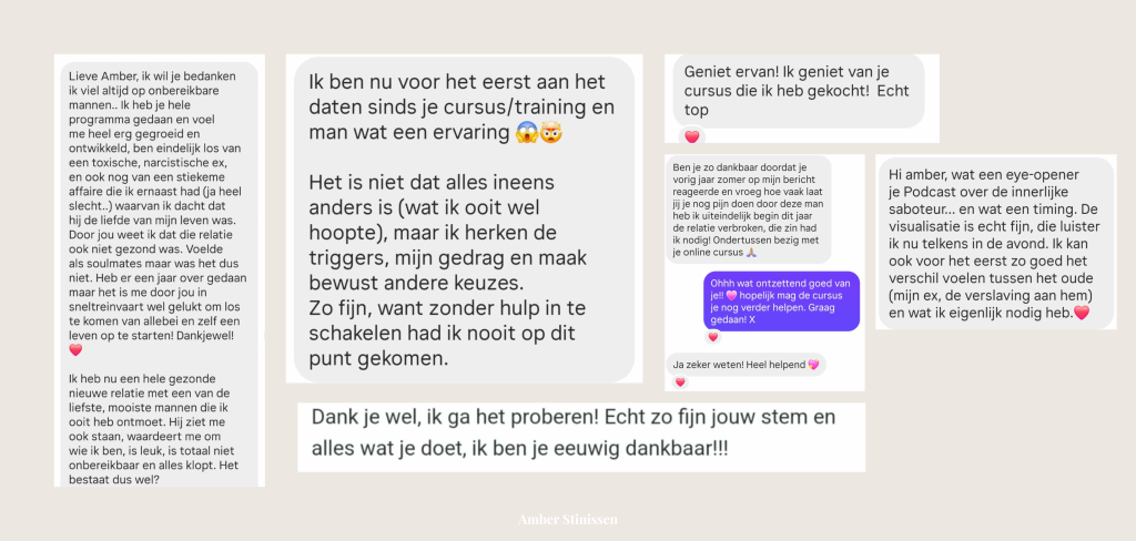 • Naar de Amber Stinissen podcast luistert, jezelf in zo ongeveer alles herkent en graag de volgende stap wilt zetten om je ongezonde liefdespatronen te doorbreken.
